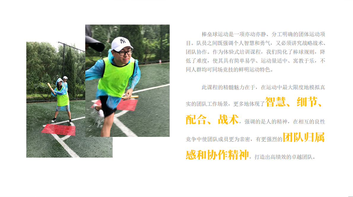團(tuán)隊(duì)共創(chuàng),從體驗(yàn)看現(xiàn)象,從現(xiàn)象看本質(zhì),從本質(zhì)找突破,強(qiáng)調(diào)的是體驗(yàn)!目標(biāo)導(dǎo)向、團(tuán)隊(duì)思維;借助棒球運(yùn)動(dòng),檢視團(tuán)隊(duì)狀態(tài)。